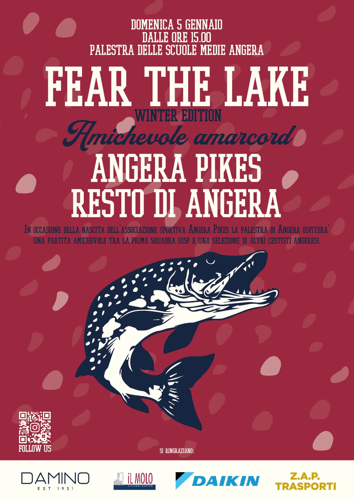 La nuova Associazione Sportiva Dilettantistica Angera Pikes invita alla prima partita di pallacanestro, periodo invernale, fra la prima squadra UISP (Unione Italiana Sport per Tutti) e una selezione di altri cestisti angeresi.