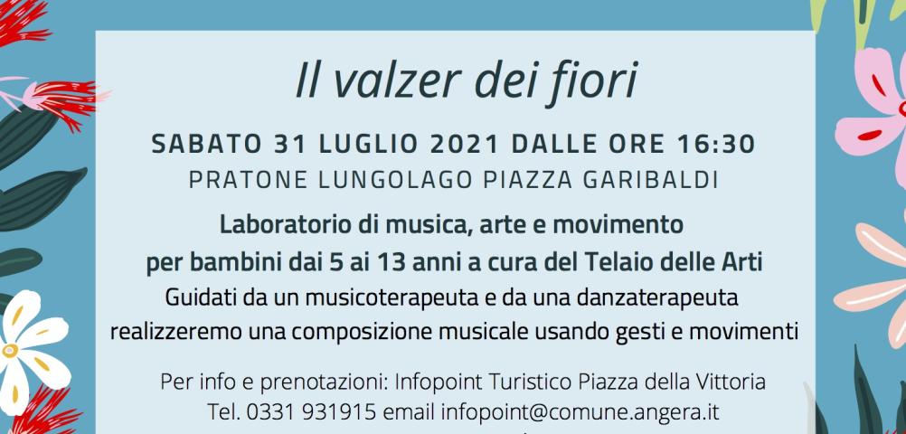 La Città di Angera, Assessorato alla Cultura, invita i bambini dai 5 ai 13 anni al laboratorio "Il valzer dei fiori" evento speciale correlato al tema "Rifiorire" proposto quest'anno dal Festival Il Lago Cromatico.