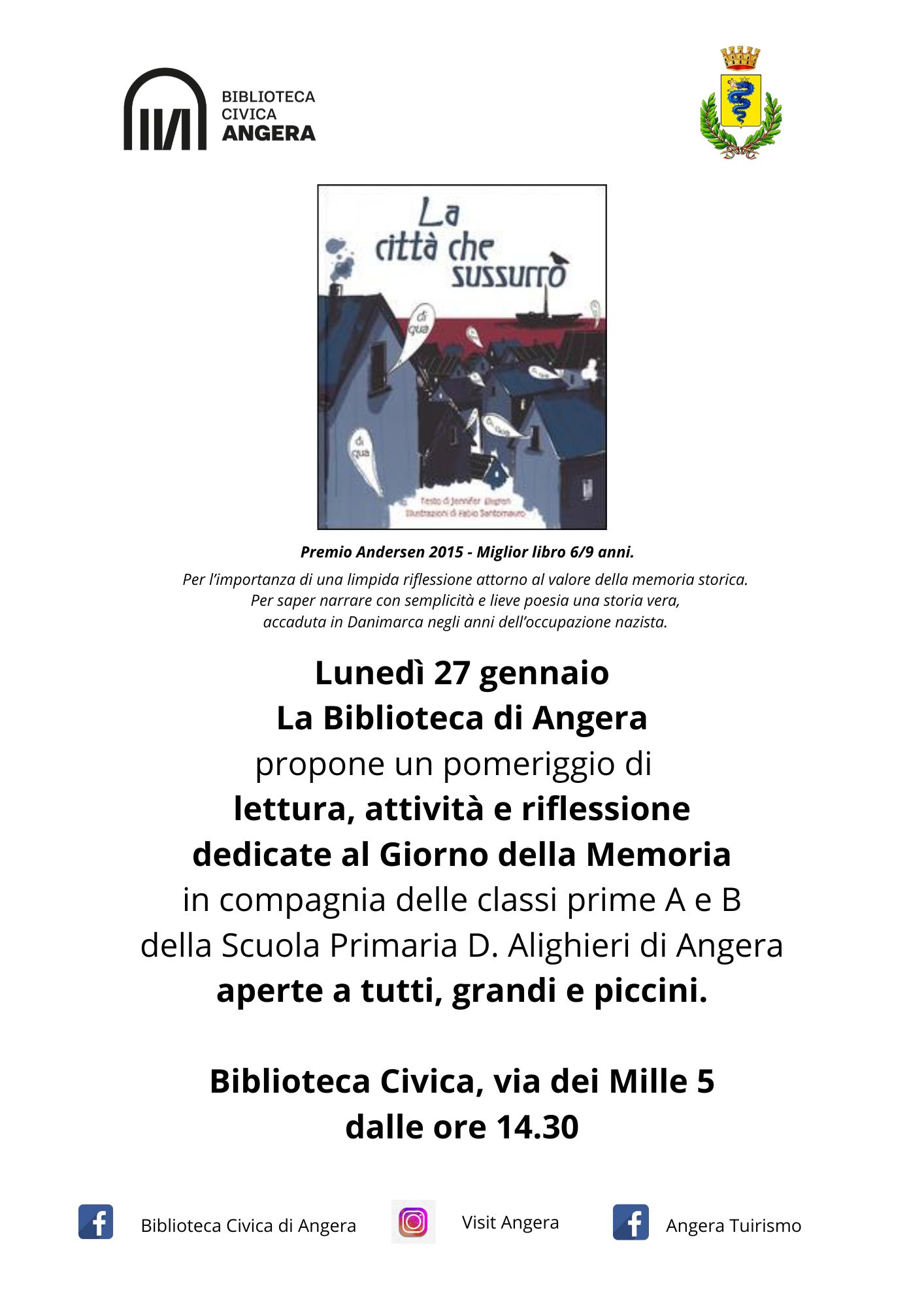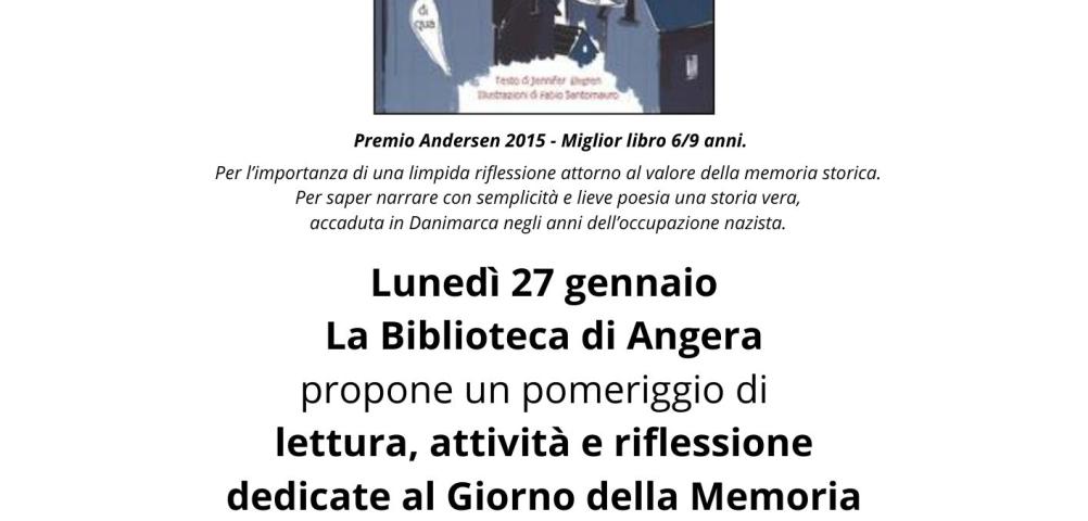 Biblioteca Civica propone un pomeriggio di lettura, attività e riflessione nel Giorno della Memoria in compagnia delle prime classi della Scuola Primaria di Angera - sezioni A e B. L'incontro prende spunto da La città che sussurrò di Jennifer Elvgren Premio Andersen 2015.