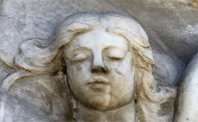 La bella lastra marmorea, risalente probabilmente alla fin dell’Ottocento, mostra San Michele, alato, vestito con una corta tunichetta leggera e calzari a cavigliera che lasciano aperte le dita dei piedi; tiene saldamente fra le mani la lancia con la punta rivolta verso il basso, destinata a trafiggere il drago alato che l’arcangelo tiene fermo sotto il piede destro. La resa scultorea del mostruoso animale non rende forse giustizia alla sua satanica ferocia.