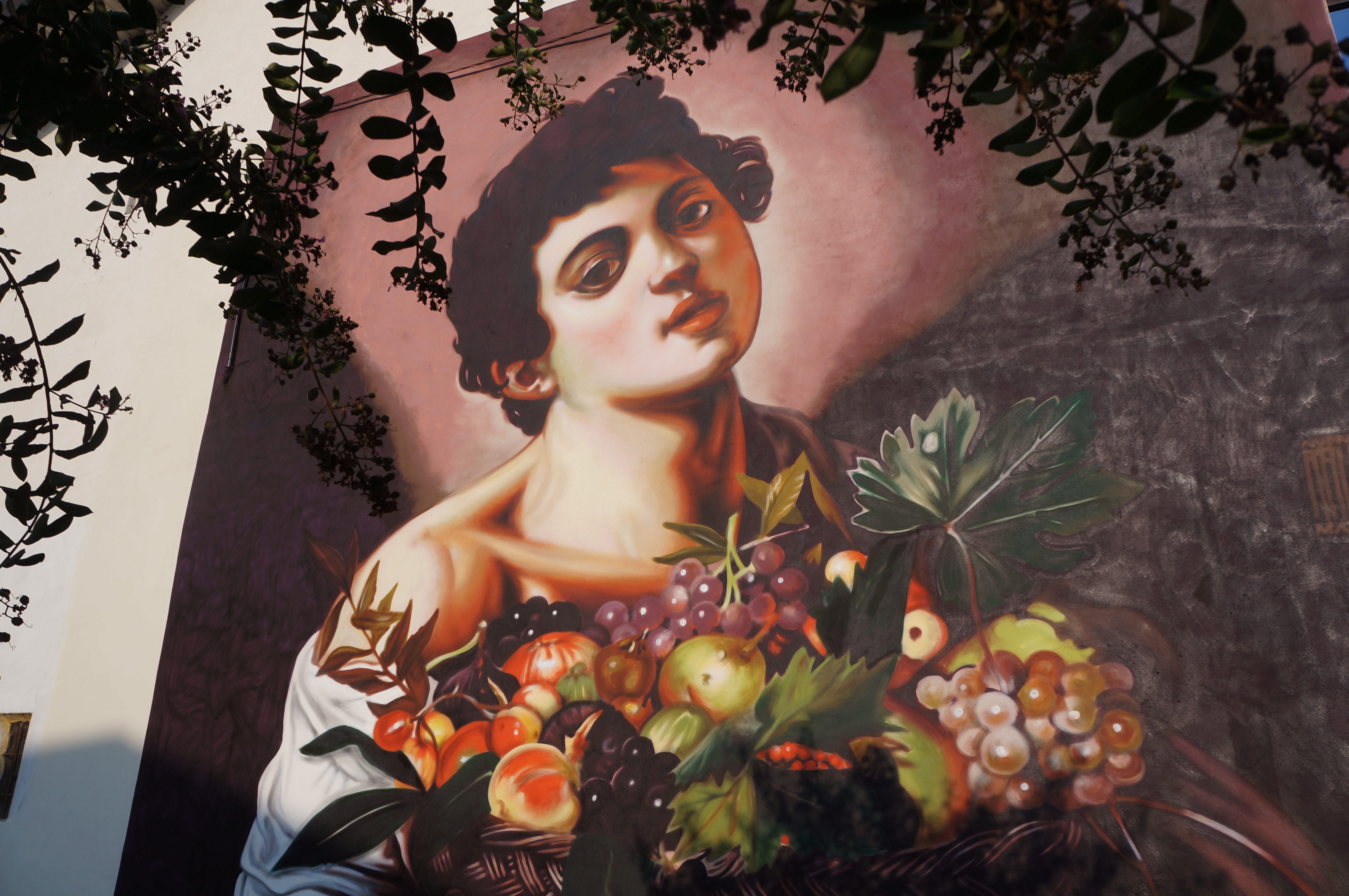 Riproduzione con la tecnica dei colori spray del dipinto di Caravaggio (1571-1610) Il fanciullo con canestra di frutta, realizzata dall’artista Andrea RAVO Mattoni in occasione del Settembre Angerese 2016, nell’ambito del suo progetto Una Pinacoteca a cielo aperto. L’opera è stata realizzata grazie al contributo della Famiglia Tedeschi e della comunità angerese.
