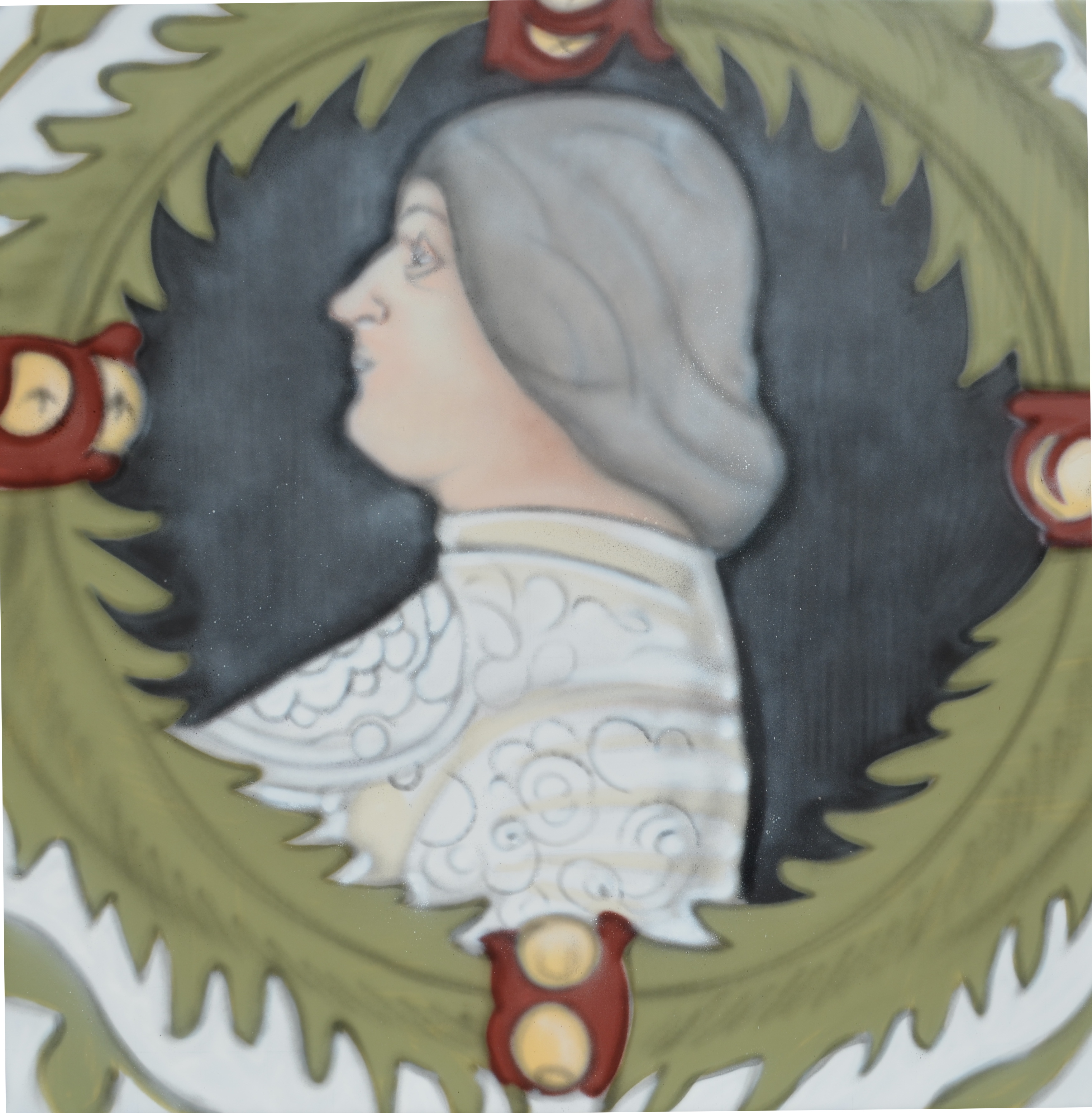Particolare dell’affresco di Casa Forni raffigurante il ritratto con armatura di Ludovico Maria Sforza detto il Moro all’interno di una ghirlanda. Andrea Ravo Mattoni, 2019, bombolette spray su tela in pvc, 1,3 x 1,3 m. L’affresco è stato recentemente riscoperto e restaurato in occasione di lavori di ristrutturazione di Casa Forni, in Via Greppi, e non è accessibile al pubblico. Si trova in una sala del primo piano che presenta una decorazione su tutti e quattro i lati, nella parte sommitale della parete. Sono raffigurati, all’interno di ghirlande, ritratti di uomini e donne appartenenti a famiglie nobiliari del territorio, affiancati dai propri stemmi araldici, tra cui Castiglioni, Besozzi e Sforza; ad essi si aggiunge il ritratto dell’imperatore romano Nerva, forse da associare ad alcune leggende legate alla famiglia Sforza. Tra i ritratti è possibile riconoscere Francesco I Sforza, Bianca Maria Visconti e Ludovico Maria Sforza, detto il Moro. L’analisi degli stemmi e dei ritratti suggerisce una datazione alla fine del 1400, appena prima della caduta di Ludovico il Moro nel 1499. Sotto i ritratti e gli scudi la decorazione è completata da elementi vegetali uniti da nastri annodati, che sembrano richiamare gli affreschi realizzati da Leonardo da Vinci nella Sala delle Asse al Castello Sforzesco di Milano. L’ipotesi emersa dai primi studi, suggerisce che la casa possa essere appartenuta a Ettore Besozzi e Clara Castiglioni e che gli affreschi siano stati realizzati in occasione delle loro nozze. La presenza di stemmi e ritratti sforzeschi potrebbe indicare che l’edificio abbia anche ospitato il Capitano del Lago, un magistrato incaricato di controllare le sponde del Verbano per conto del duca di Milano. I possedimenti viscontei del lago, inclusa la Rocca di Angera, erano infatti passati nel 1447 alla Famiglia Borromeo. Ludovico il Moro cercò di recuperare il controllo del ducato sul Maggiore ponendo ad Angera il Capitaneato, nominandola città nel 1497 e quindi garantendo al borgo l’autonomia dai Borromeo: le città non potevano infatti essere infeudate. Il Moro concesse inoltre agli Angeresi la possibilità di svolgere mercato e due fiere annuali, una dedicata al bestiame, in primavera, e una in settembre per festeggiare la vendemmia, celebrata ancora oggi con sfilate di carri vendemmiali. Gli affreschi sono in corso di studio. Vedi sito n. 8 del Museo Diffuso di Angera - www.angera.it