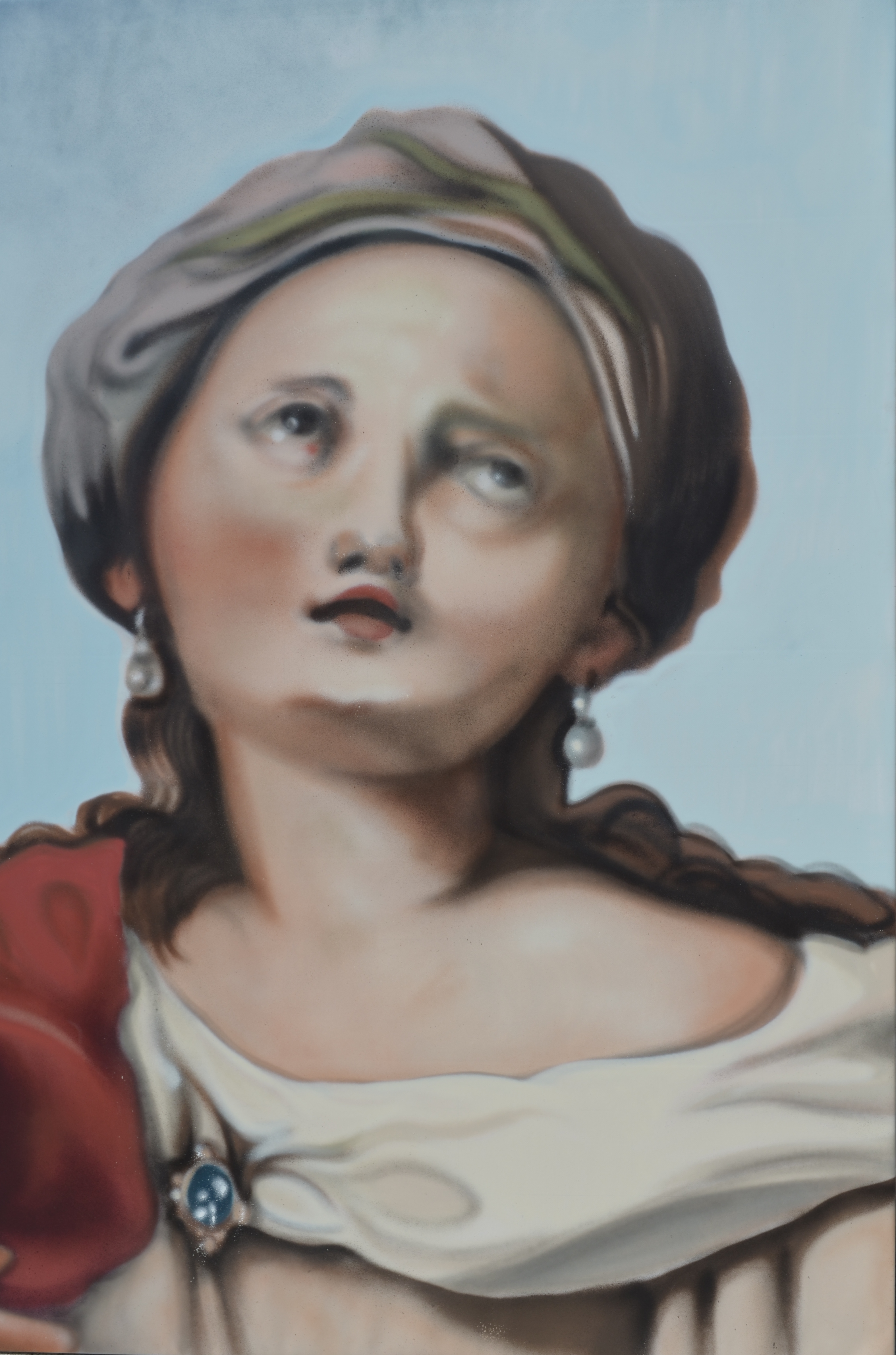 Particolare del volto del dipinto su tela raffigurante Santa Liberata. Andrea Ravo Mattoni, 2019, bombolette spray su tela in pvc, 2 x 1,5 m. L’opera, di proprietà della Parrocchia e non accessibile al pubblico, proveniva dall’omonima chiesa che si trovava in Via Lombardia e che venne sconsacrata e trasformata in edifico privato nel corso del 1800. Il dipinto originale mostra una giovane donna in piedi, vestita con ricche vesti gialle e verdi, un mantello rosso, orecchini di perle e un prezioso fermaglio sul petto. I capelli raccolti e coperti da un panno chiaro avvolto intorno alla testa, il volto e lo sguardo sono rivolti alla sua sinistra verso il cielo. La santa tiene in braccio a destra un neonato completamente avvolto da fasce bianche, la mano sinistra è appoggiata ad un piano di roccia su cui appare un altro bimbo addormentato con una veste bianca. Lo sfondo scuro non permette di definire con certezza l’ambientazione della scena, sembra trattarsi di un paesaggio naturale con alberi e rocce. Ad Angera il culto di Santa Liberata sopravvisse a lungo, era venerata quale nutrice e protettrice contro i pericoli del parto e delle malattie infantili. Fino a pochi anni fa, le donne di Angera, Capronno, Cadrezzate, Ispra e di numerosi comuni vicini, si riunivano ancora il 18 gennaio per un pranzo in suo onore, riservato alle sole donne sposate o prossime al matrimonio, la festa delle Donne! La storia di Liberata è antica e complessa, diverse sono infatti le sante che portano questo nome, ma tutte hanno in comune il fatto di essere accompagnate nel culto da sorelle o da altre sante con cui tutelano la salute dei nascituri e delle partorienti. La preghiera alla santa recita inequivocabilmente: Liberata, fa’ che l’uscita sia dolce come l’entrata. Sembra che la venerazione della Santa e delle sue sorelle sia la trasposizione cristiana di un culto pagano millenario, legato ai cicli di nascita, destino, morte e rigenerazione, il culto delle dee Matronae, protettrici delle madri e dei bambini, chiamate anche Fatae, perché in grado di prevedere il fato, il destino del nascituro. Tale culto è attestato ad Angera e nel territorio da almeno 2000 anni, come testimonia un importante altare romano rinvenuto ad Angera e oggi esposto presso il Museo Archeologico di Varese, in cui le dee danzano tenendosi per mano sotto ad una quercia. Vedi sito n. 49 del Museo Diffuso di Angera - www.angera.it