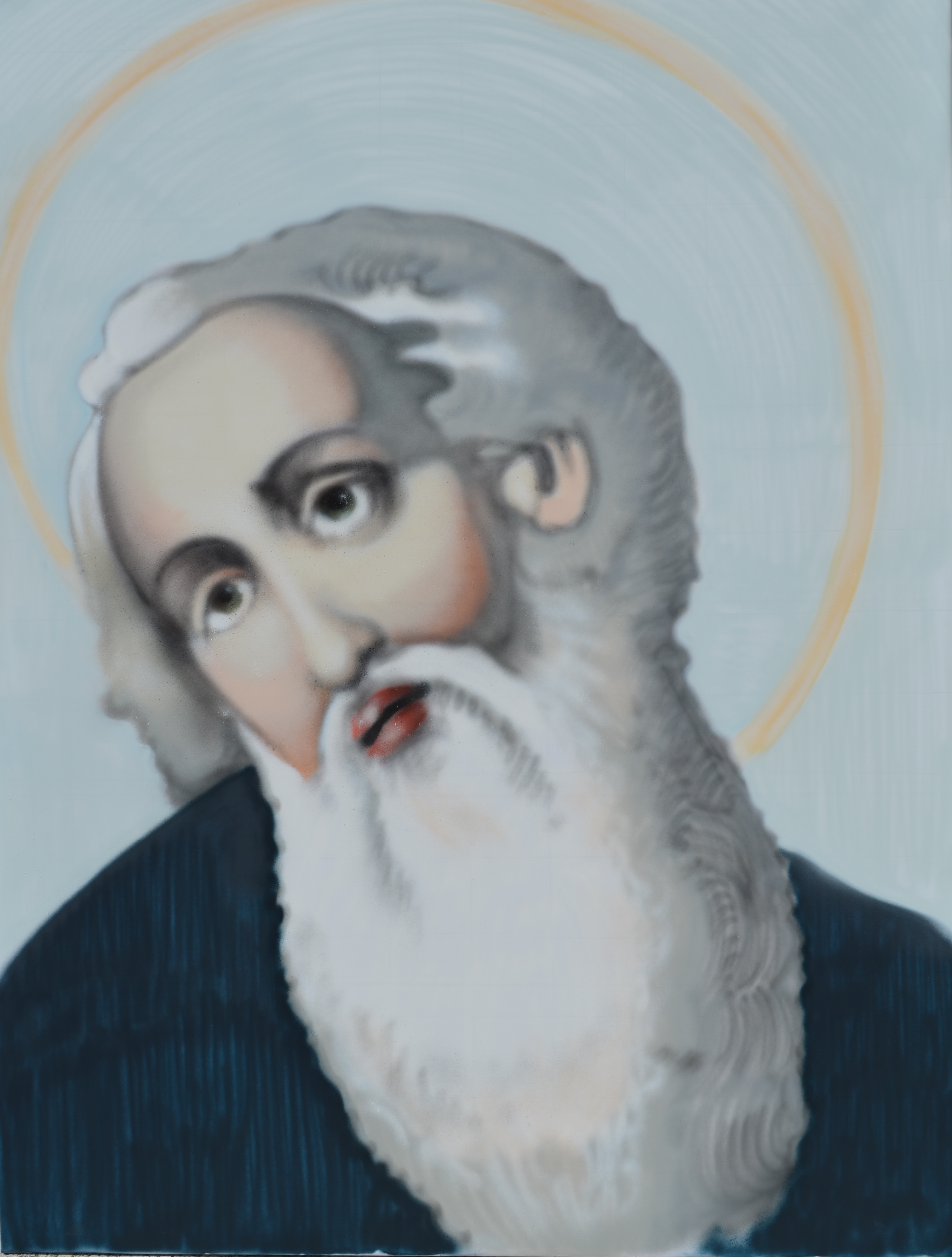 Particolare del volto dal dipinto raffigurante Sant’Antonio Abate. Andrea Ravo Mattoni, 2019, bombolette spray su tela in pvc, 2 x 1,5 m. L’opera, di proprietà della Parrocchia e non accessibile al pubblico, proveniva dall’omonima chiesa, che si trovava in Via Paletta e che venne sconsacrata e in parte demolita nella seconda metà del 1800; della chiesa rimane oggi visibile dalla strada unicamente uno stipite in pietra di Angera ornato con un elemento floreale. Il culto del Santo protettore dalle epidemie del bestiame e dalle malattie infettive dell’Uomo, era molto sentito da contadini e allevatori, come dimostrano le numerose messe, benedizioni degli animali e processioni alle stalle, ricordate nei diari capitolari della Parrocchia di Angera, studiati da Luciano Besozzi. La festa principale era celebrata il 17 gennaio.