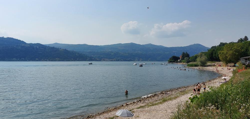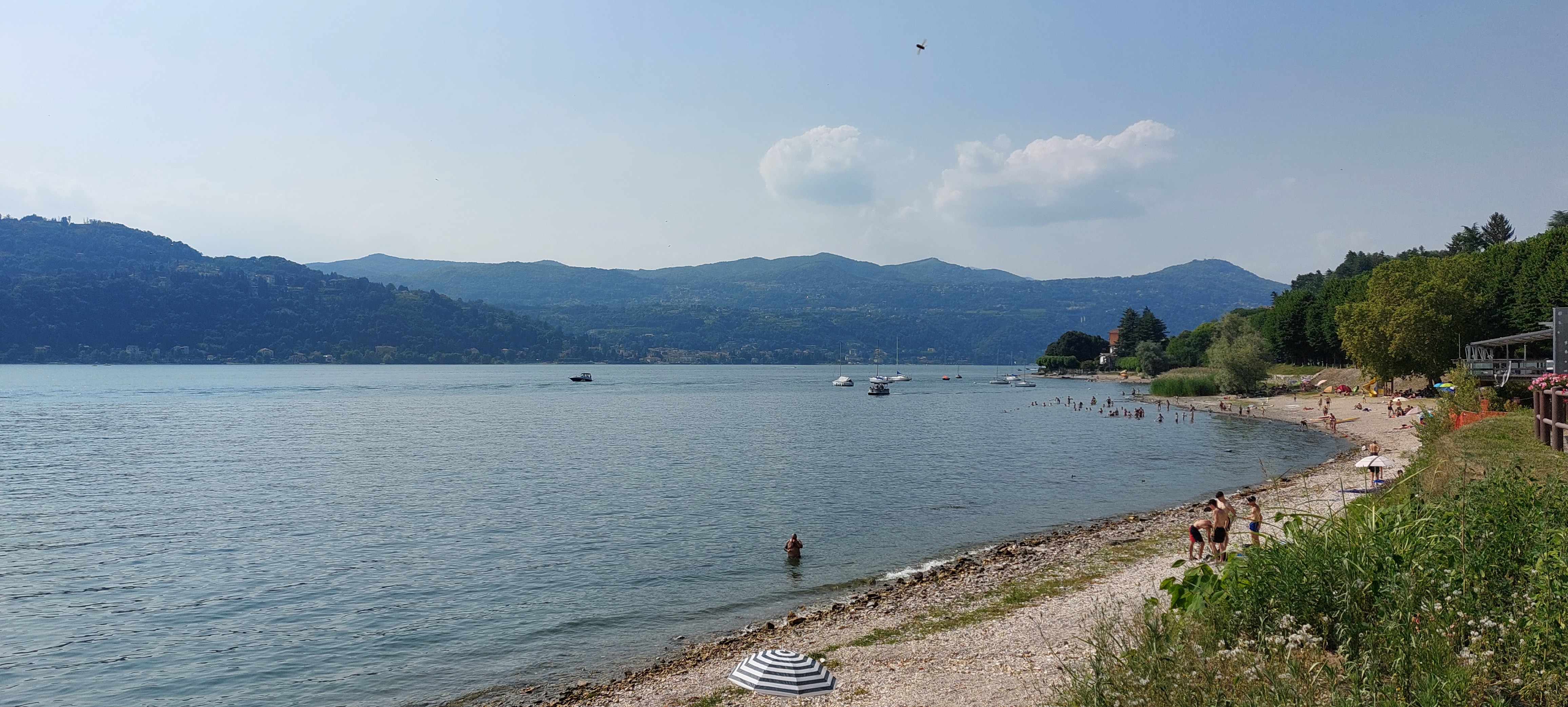 La spiaggia comunale della Noce, caratterizzata da sabbia e ghiaino, prende il nome dal grande albero che vi si trova al centro e che offre ombra e frescura fino a oltre mezzogiorno. La spiaggia è accessibile tramite un passaggio asfaltato nella prima parte da cui inizia uno scivolo per carrozzine e disabili che conduce sino all'area sabbiosa. L'area gioco con scivolo attrezzato rende la parte settentrionale della spiaggia adatta alla frequentazione di famiglie con bambini. Nei mesi di luglio e agosto, nel pomeriggio é presente il servizio di salvamento attivato dall'Autorità di Bacino Lacuale.