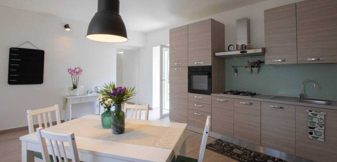 Cucina: frigorifero, freezer, forno, piano cottura a gas, pentole, padelle, piatti e bicchieri, bollitore, calici da vino, teglie da forno
